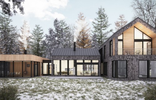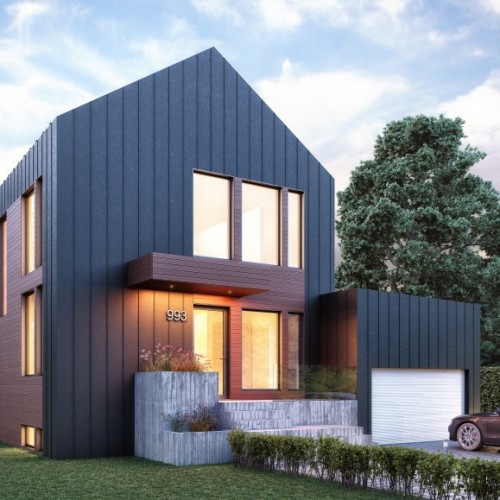 This inspiration has been designed for an urban or smaller country setting in a lot size usually around 50 feet long. There is a main open-plan living space with a garage attached. The model’s large windows maximize natural light and enhance the feeling of interior space. Its dark grey steel with reddish wood planks for the facade give it an urban feel that is also reminiscent of a barn-style country home.