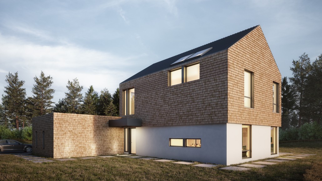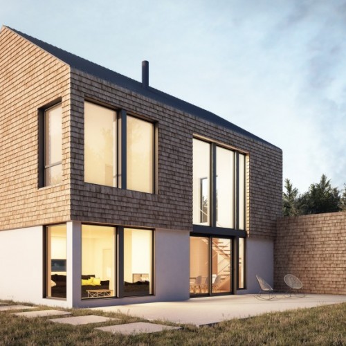 This inspiration combines the tactile pleasure of traditional rural surfaces with the style of modern contemporary living. It features two volumes, one a main living space on two floors with a fireplace as a focal point, the other a broad horizontal volume containing the garage, some service areas, an office and master bedroom. Oversized windows allow light to flood the interior spaces and provide outstanding views of the surrounding nature.
