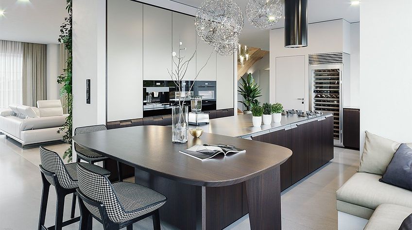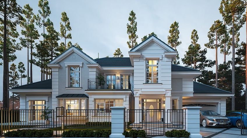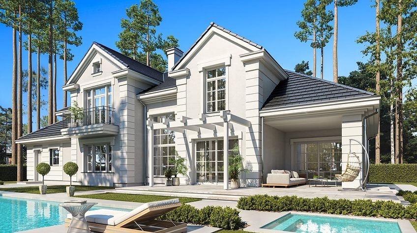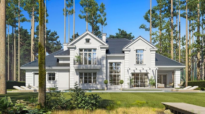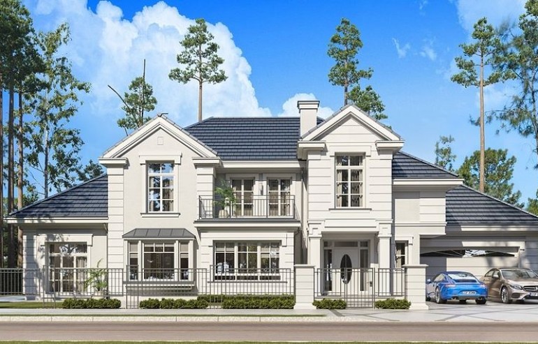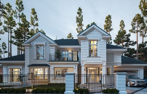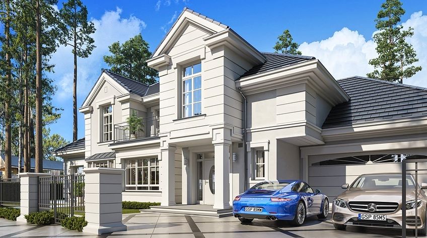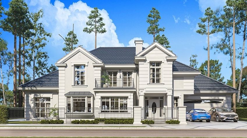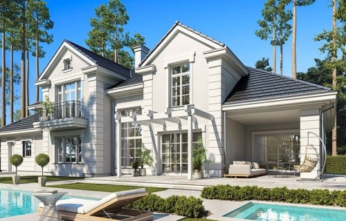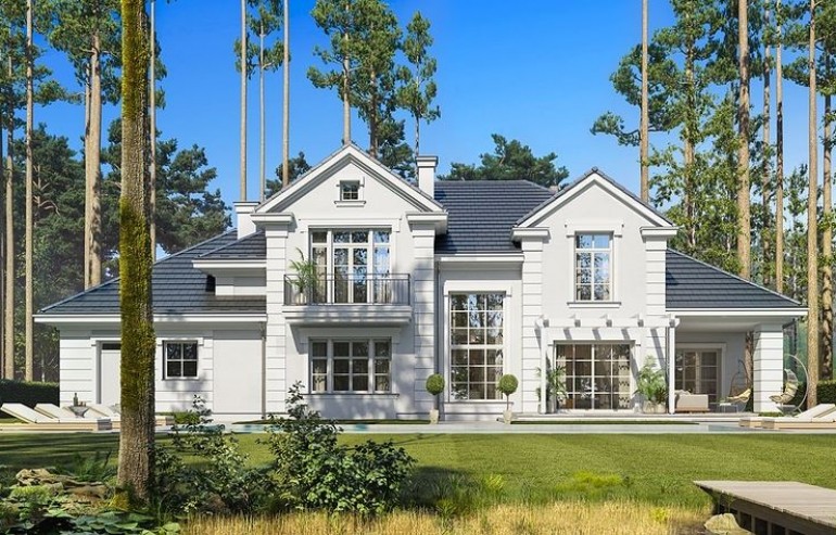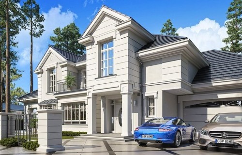 We present the Villa Seat project with a classic representative villa, whose architectural style refers to the best twentieth-century designs of suburban residences. The design draws on the historical patterns of residential architecture, is full of interesting details, and at the same time combines the completely modern function of a comfortable single-family house. The building is designed on a rectangular plan, with a wide front and garden façade, so that it fits perfectly on a square-shaped plot, leaving room for a nice garden and a lot of space from the front. The fragmented body consists of several smaller fragments. The core of the house is a multi-storey part enclosed around one-story extensions. From the front we have a beautifully accentuated entrance, with wide doors with floodlights, leading to the vestibule and the large hall. The front is also two beautiful bay windows - the kitchen and dining room of the household, and a balcony from the lounge-library on the first floor. The garage, set back a few meters to the rear, is inconspicuous, and at the same time moving back the garage increases the driveway. The rear facade of the villa is equally interesting. We have a two-story window from the living room opening a view of the garden and beautifully illuminating the living room, and two exits to the terrace - under the romantic pergola, and to a large arcade - a part of the terrace roofing. The large window from the study also opens onto the garden side. Upstairs, a wide balcony window with a balcony connects the bedroom of your house with a garden view. The interior of the house is functionally divided as follows: the entrance zone on the ground floor consists of a vestibule with a cloakroom, connected with a representative hall with stairs in front of the entrance. The end of this axis is the office. From the hall we go left to the living area, more private, and here we have a living room with a void open to the mezzanine on the first floor, a dining room - a real dining room, and a kitchen with a mini-dining room for quick everyday meals. The right side of the house is a garage with a utility room. The first floor is divided into two parts - separated by a void above the living room and a mezzanine, which is the home library and at the same time an extension of the ground floor living room. On the left side there are two children's bedrooms with wardrobes and a bathroom, on the right side there is a parents' apartment with a wardrobe and a bathing room, and one more bedroom with a bathroom. The house, despite its extensive plan and functions, and a truly representative silhouette, is not that big. Its surface is slightly larger than a normal single-family house, thus proving that you do not need to build a thousand-meter colossus to have everything - the whole set. The house is designed with energy-saving materials, has good insulation and modern installations. It will be inexpensive to use. When it comes to construction costs - it won't be cheap, but the end result is worth the sin in our opinion. If you want to have something beautiful, above average - it has to cost above average. This house will not leave anyone indifferent. Welcome!