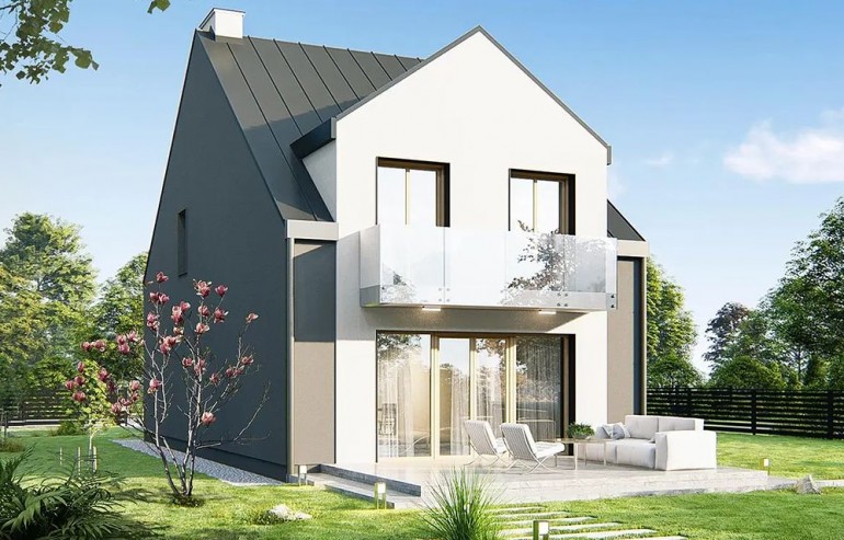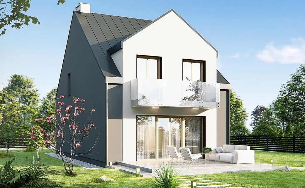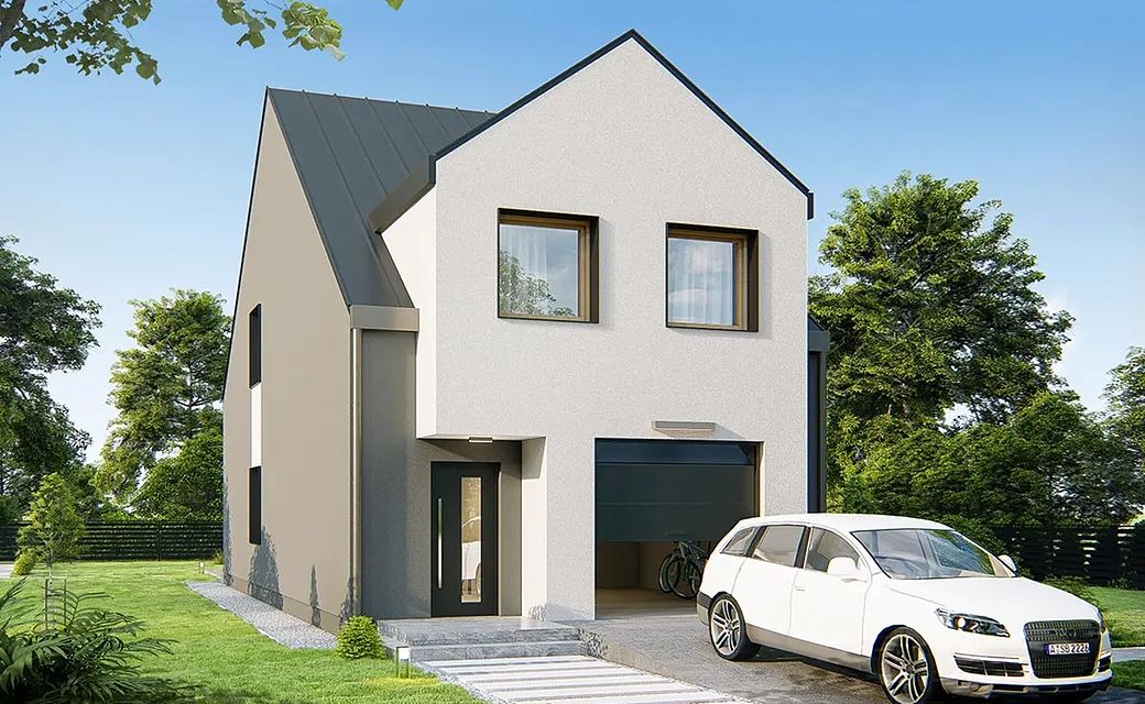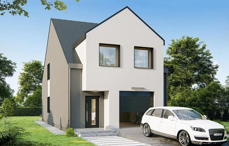 A comfortable, very functional house on a narrow plot of land. (You can even fit it on a plot 13.5 m wide) The ground floor is a large, comfortable living room with a spacious kitchen, toilet, and a large garage with space for bicycles and a utility room. The attic consists of four bedrooms with a wardrobe, bathroom and laundry room.