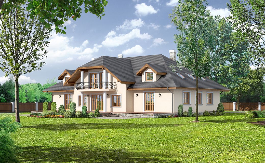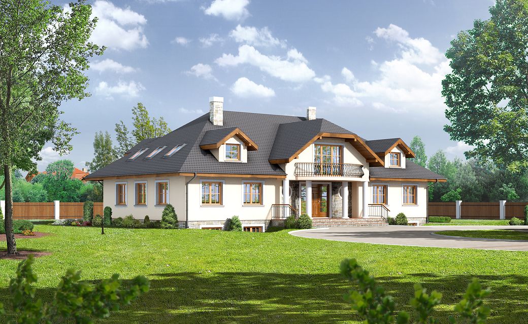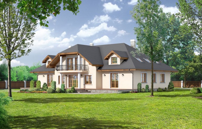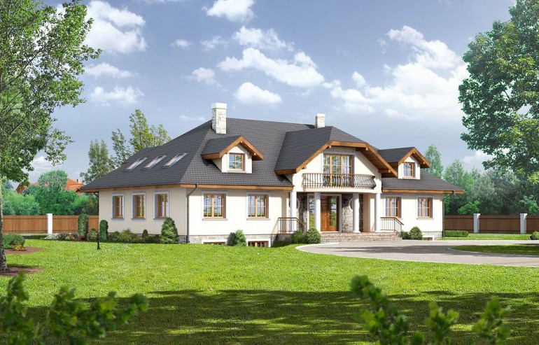 The building Gdów new 9 is a variant of the well-known Gdów new project. Unlike the basic version, the design has more rooms, a larger area, a basement. The house plan, Gdów Nowe 9, is a perfect solution for people with a plot of medium width. The house has a simple shape, which makes it cheap to build. The design has a ridge parallel to the road, which is often specified in the spatial development plan. The project was designed for plots that allow the house to be located in a detached building. It is also an excellent proposition for people looking for a house with an envelope roof, which is characterized by high resistance to adverse weather conditions. The Gdów new 9 project is a one-story house with a usable attic, thanks to which the household members can enjoy more privacy. The building has a basement where a laundry room and a utility room can be arranged. Supporters of spacious spaces will surely be pleased with the living area provided for in the design. It is made up of, among other things, a kitchen, which thanks to its dimensions is fully adjustable and functional. The pantry included in the design will greatly facilitate keeping order. The day zone is also created by a spacious living room and dining room. Additionally, the living room has a fireplace, which gives the interior a unique atmosphere. The seven bedrooms included in the house are the optimal option for a large family. The space can also be used as a guest room or office. The impressive terrace allows you to come into contact with nature without too far away from the privacy of your home. The project was created for investors who plan to build a house in brick technology. the villa.