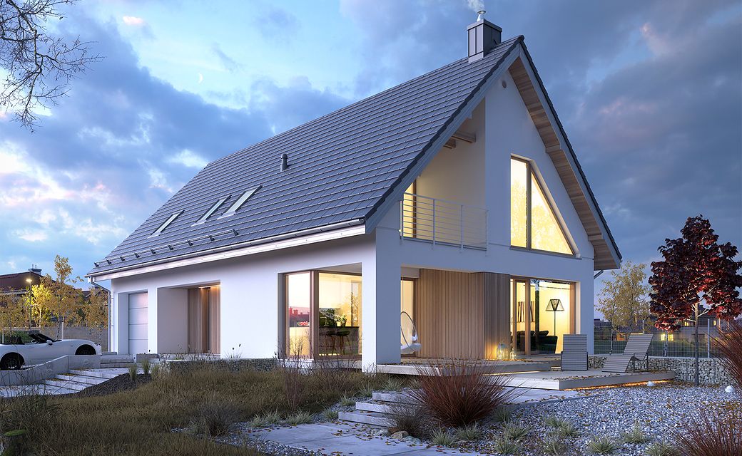 The house design of Available 6 is a perfect combination of a modern look with a fully functional interior. The house has a simple shape, which directly affects the smooth workflow. It is intended for investors who have a plot of land that allows for the implementation of a free-standing project. The building is topped with a gable roof, so its implementation does not take much time. The project belongs to the category of houses with a ridge located parallel to the road, which is often defined in development conditions. The project provides for a single garage in the body of the building, with a passage from the residential part through a practical wardrobe. Available 6 is a one-story house with an attic, which means that the day and night zones are clearly separated from each other. The living area provided for in the design will surely satisfy those who prefer spacious interiors. This zone of the house includes large glazing and an open space above the living room, thanks to which the interior looks modern and very effective. Additionally, the living room has been combined with the dining room - such a solution fits perfectly into the current arrangement trends. The kitchen is open yet slightly separated from the rest of the rooms. Thus, cooking enthusiasts can easily pursue their hobbies, and at the same time freely talk to other household members. People working at home will appreciate the fact that there is a study and a bathroom on the ground floor. An additional room is also a perfect solution if you need to spend the night. There are three spacious bedrooms in the attic. From one of them there is an entrance to an impressive loggia. On this floor there is also a bathroom, a laundry and drying room and a mezzanine - an ideal place to rest with a book. Family gatherings on sunny days will be made more pleasant by the terrace next to the house. The project was made in brick technology, thanks to which the house remains pleasantly cool in hot weather. The Available 6 project is characterized by a minimalist body with large glazing, making it an ideal choice for supporters of a modern style.