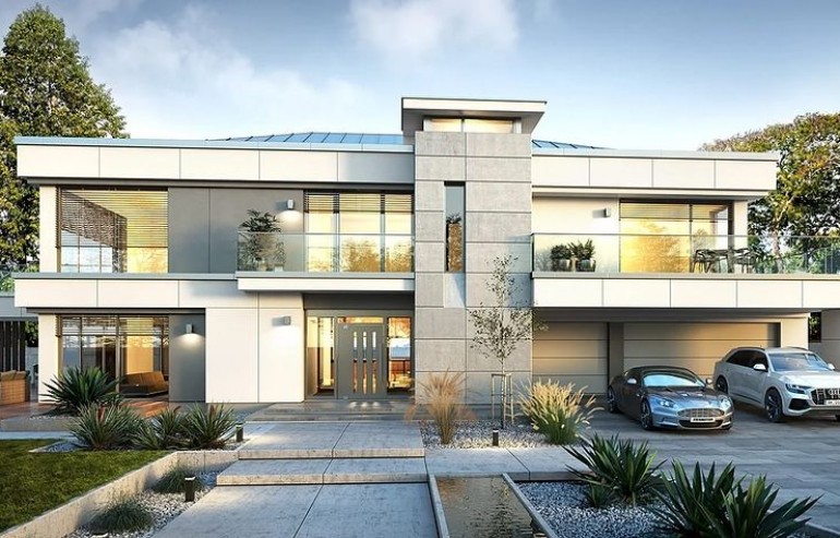 The Villa Florida 5 house plan is another luxury mansion project from the "Willa Florida" series. The house is a comfortable, two-story villa, intended for a plot with a side or front garden. The architecture of the house combines a modern form with a functional interior. Stylish, varied shape and representative interior will emphasize the status and good taste of the owners. The fragmented two-story silhouette of the house is covered with a hipped roof, practically invisible from the height of human eyes, giving the impression of a building with a flat roof, with - in fact, a sloping roof (a frequent requirement in the building conditions). The elevations have been divided into strips of windows interwoven with white beams separating the storeys, introducing rhythm and order. We enter the building through elegant wide entrance doors with side lights under the balcony roof. The front of the house is decorated here with a vertical two-story wall with skylight, large windows in the corners of the facade, and a comfortable carport in front of the three-car garage. The garden façade in Villa Flory 5 is the side façade of the house with a large covered terrace - a place for evening feasts, and large corner glazing of the living room. The interior of the ground floor is primarily a huge single-space area of the hall, living room, dining room and kitchen rooms. It is almost 150 m2 of free, open living space. There is a representative staircase to the first floor, a living room with a large void and opening to the mezzanine above, with a delightful lounge suite and a TV wall. We have a dining room with a table for 14 or more people and a beautiful gas fireplace, we have a kitchen with an island, and a garden in the center for representative plants, and plenty of space to display unique paintings and other works of art. Everything is bathed in the light of wide, two-story glazing. In the back room, behind the kitchen, we have utility rooms such as a laundry room, pantry or boiler room. At the entrance: a cloakroom, toilet and access to a three-car garage. The first floor is the master bedroom with wardrobes and a bathroom, and an additional spare room and two children's bedrooms with their own second bathroom. A beautifully glazed home office or library room hangs above the living room, and a mezzanine opening onto the ground floor and the garden. All rooms on the first floor have access to the surrounding terraces. The master bedroom has a separate very large terrace overlooking the garden. Willa Flory 5 is another proposal of a large luxury house for brave Investors who want to fulfill their dreams of a unique place to live, who want to enjoy remarkable - modern at the same time non-flashy and tasteful architecture.