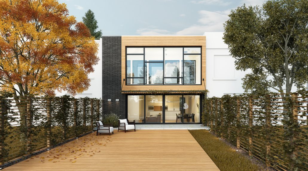 This inspiration has an interior courtyard on the top floor inside the building, with double-height ceilings at the back of the building in the living room and dining room. The latter features a 20-foot patio door and a glass curtain wall leading out to a backyard JNCN HOMES pergola.