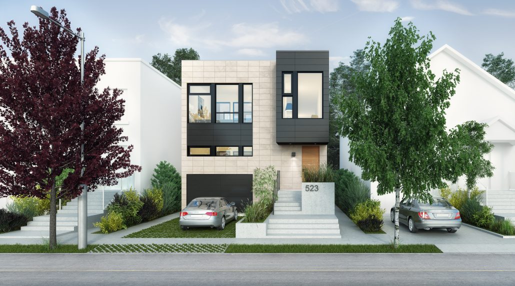 The living room at the front of the building features a fireplace and is cantilevered over the entrance and leads through to the master bedroom with an open bathroom, a walk-in closet and a TV room facing the interior courtyard. The corridor leading to the large master bedroom has a double-height ceiling with natural light from a full glass wall that looks through to the interior courtyard. The first floor kitchen and dining room are separated from the living room by the interior courtyard and staircase, while a backyard patio is covered for privacy with a JNCN pergola that extends the kitchen area to form an urban garden. The home also features two bedrooms, a shared bathroom, and a laundry/utility room, with a mudroom shared between the garage entrance and the main entrance.