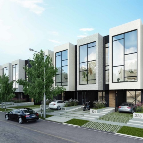 From the outside, the remarkable features are a large cantilever that forms a covering for the car port and smaller one extending from the living room to cover the entrance. Since the kitchen and dining area are on the top floor, we incorporated a service elevator from the main floor laundry room to the pantry on the upper floor. The social spaces have much more light because they are on the top floor, and natural light floods in through double-height living room windows.