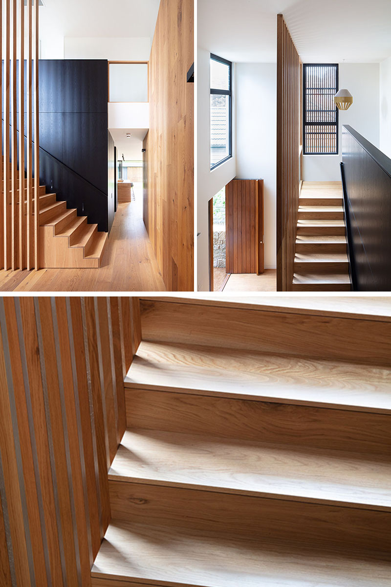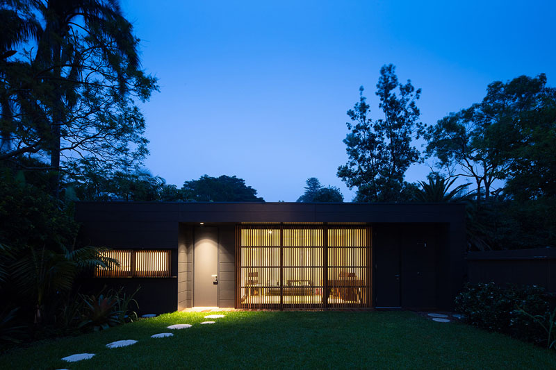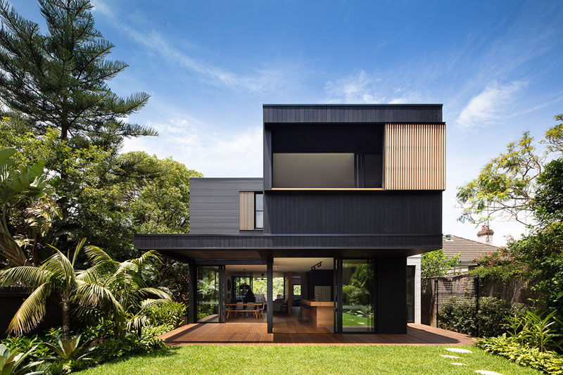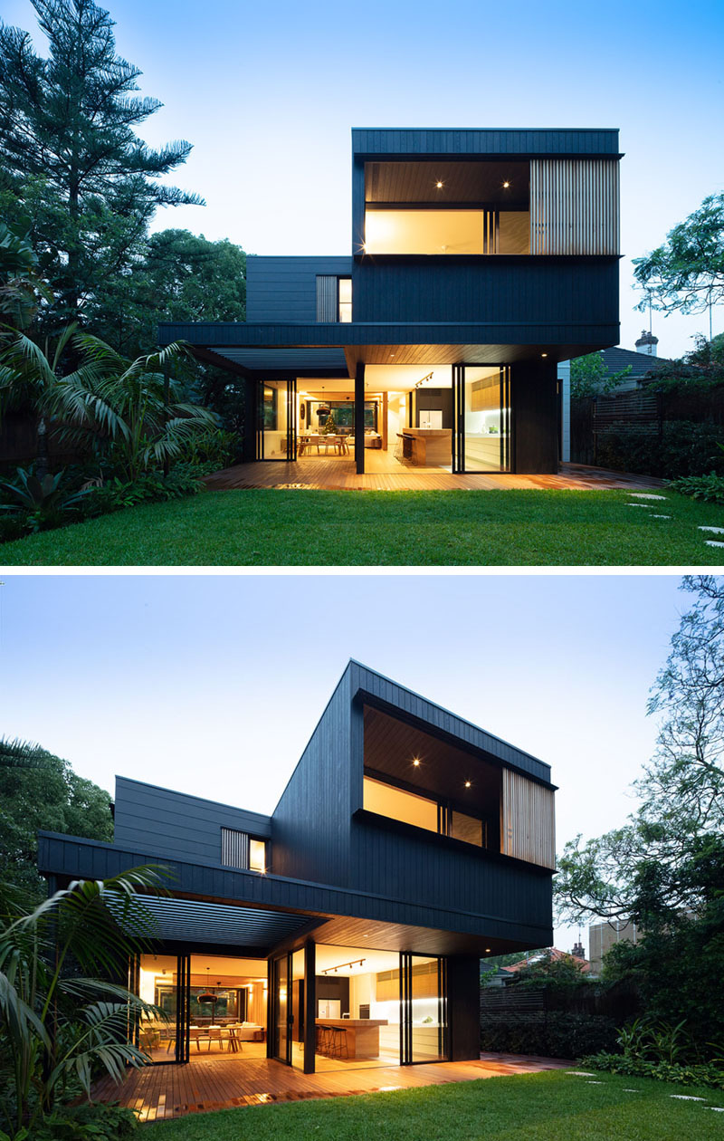 The Exterior Of This House Has Blackened Wood Siding With Contrasting Light Wood Shutters