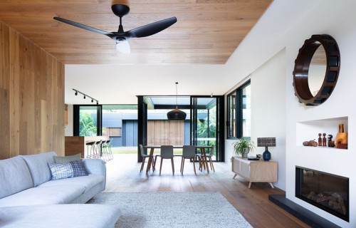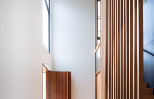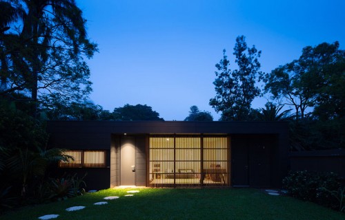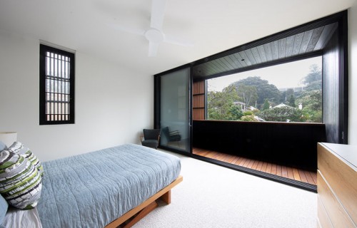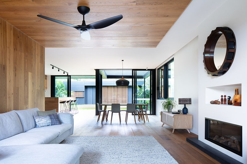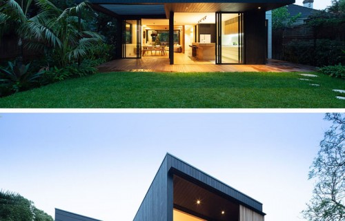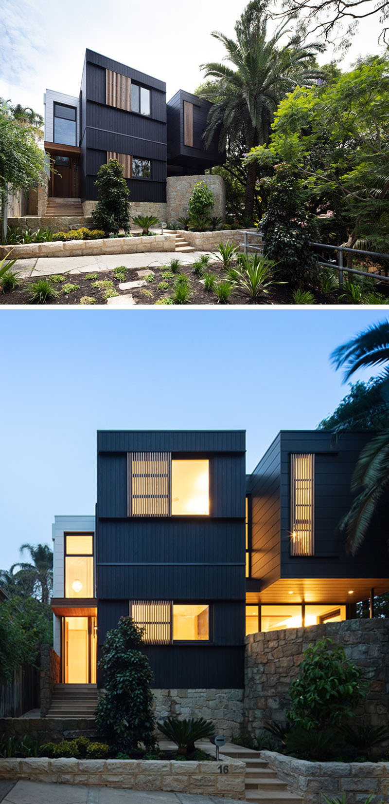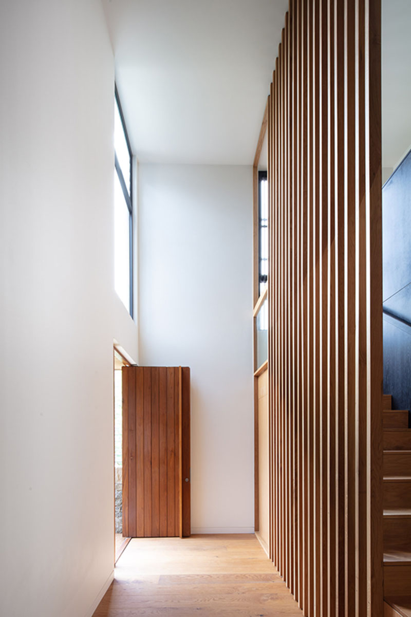 The Exterior Of This House Has Blackened Wood Siding With Contrasting Light Wood Shutters