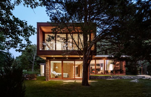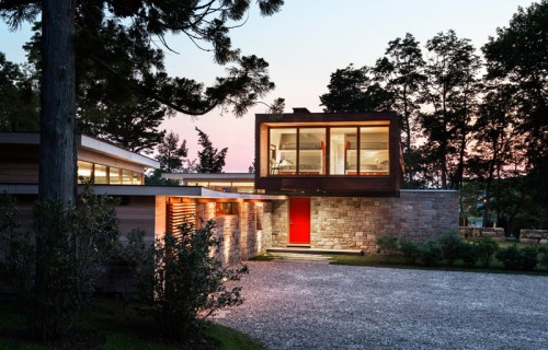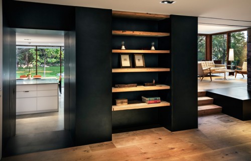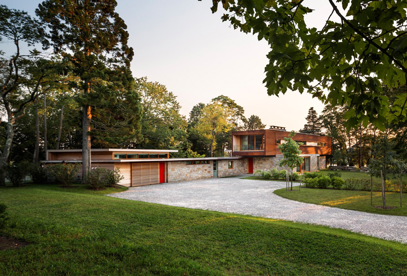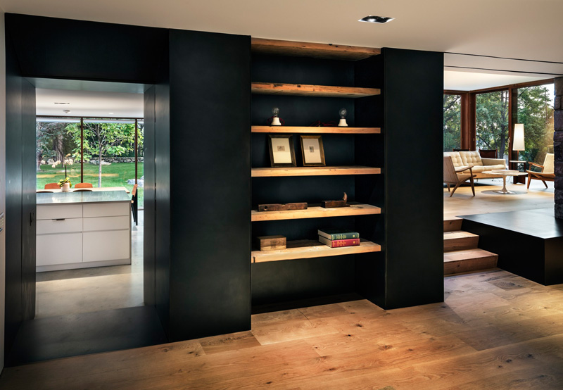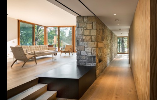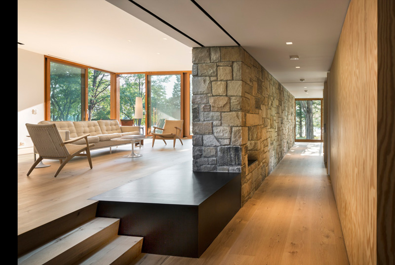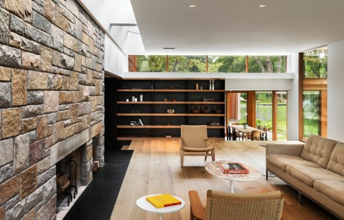 A large stone wall runs through this redesigned home in Connecticut