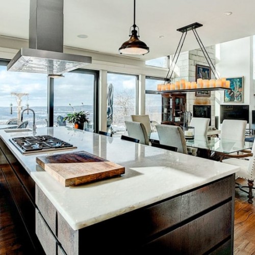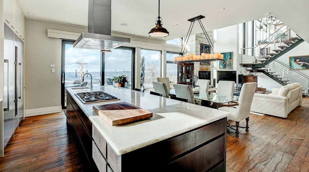 An active, retired couple who love the great outdoors designed a home with astonishing views of the valley and surrounding forest. Built with one main floor and a walkout basement, the home’s high ceilings, and expansive living space have been designed with simple, practical, and yet extremely eye-catching architecture. Features also include a large, open-plan kitchen and dining room, plus a car port.